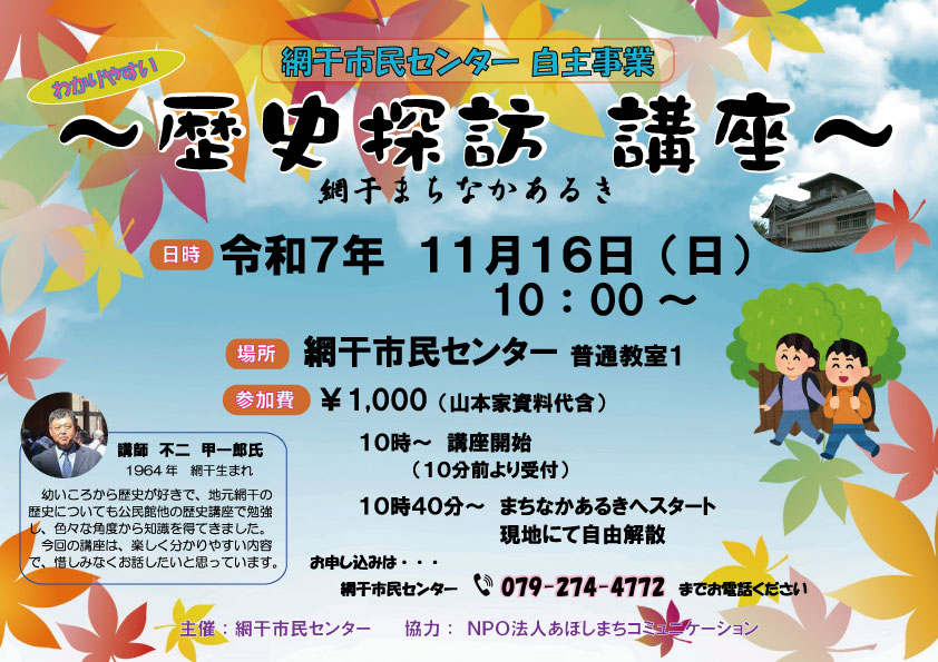 2025年11月11日 / 最終更新日時 : 2025年11月11日 管理スタッフ お知らせ網干市民センター 【歴史探訪 講座】 いよいよ今週の日曜日でございます。網干市民センター主催の「歴史探訪講座」~網干まちなかあるき~ あと少し残数がありますので、ご興味のある方はぜひご参加ください! FacebookXHatenaPocketCopy
