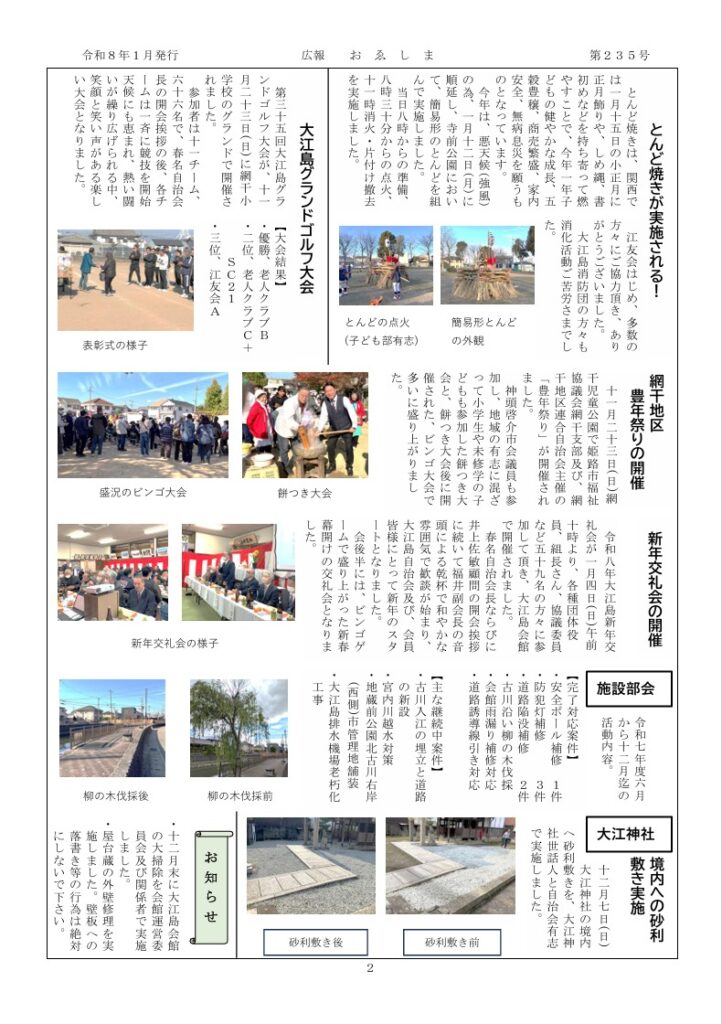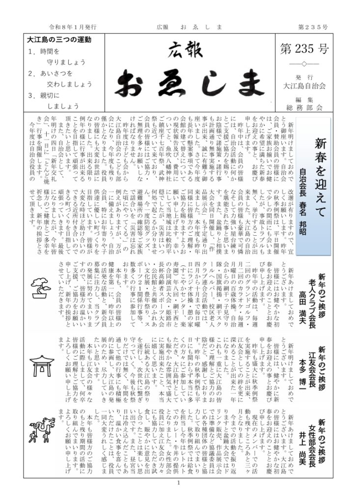 2026年2月16日 / 最終更新日時 : 2026年2月16日 大江島自治会 お知らせ大江島自治会 広報おゑしま 第235号(令和8年1月発行) / FacebookXHatenaPocketCopy
