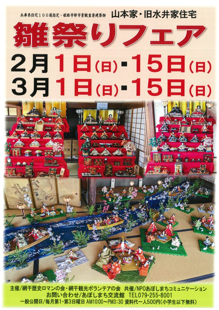 2026年2月24日 / 最終更新日時 : 2026年2月24日 管理スタッフ お知らせ網干歴史ロマンの会 【雛祭りフェア】 恒例となってまいりました。今年も開催します。「雛祭りフェア」 地元の幼稚園や小学校の皆さんが見学に来られたり。 所狭しと展示しています。どうぞ、お見逃しなく^^ FacebookXHatenaPocketCopy
